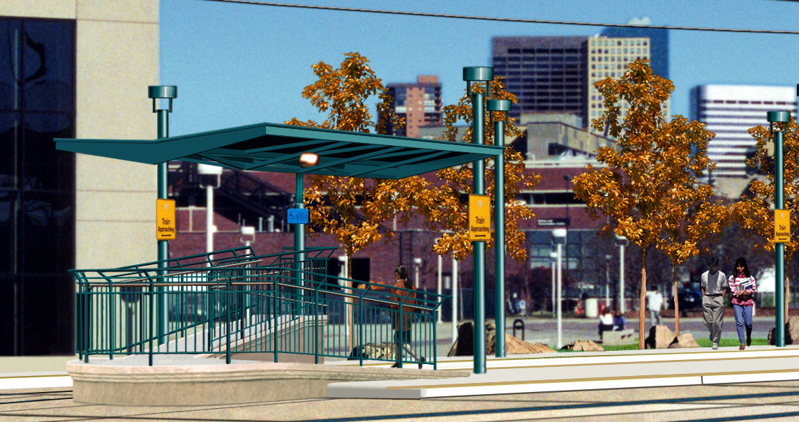 POITRA then created a 3D site model that included the track bed, rails, LRT platforms, station amenities, canopies, catenary system and POITRA model RTD Siemens Duewag 100 LRT vehicles. The model was camera matched, lighted, rendered and composited with the base photograph. Landscaping and station patrons were added to create the final LRT photo-simulation.