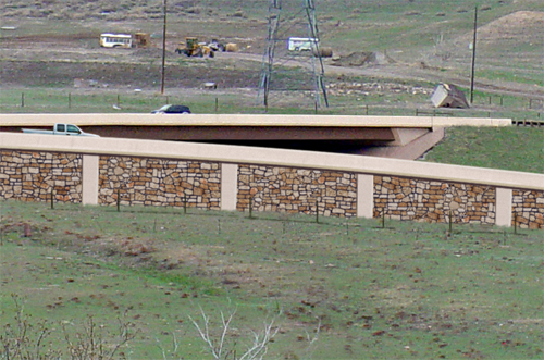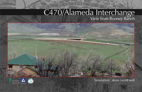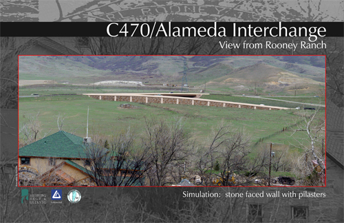A photograph was selected from the survey to represent existing conditions for the simulations. The alternatives included a fill slope on district property with native seeding or retaining wall. Architectural wall treatments included a conventional wall, a stone faced wall or a stone faced wall with accent pilasters.
