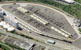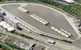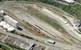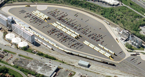 UPRR provided preliminary CADD site plans for the proposed facility which were perspective matched to the aerial base photograph. POITRA then painted the areas of layout using it's experience visiting similar existing facilities. Truck runways were rendered as concrete and auto parking as asphalt using digital painting methods. All rail, roadway and parking striping were added in the same manner. The layout was populated using POITRA 3D stock model railroad equipment.
