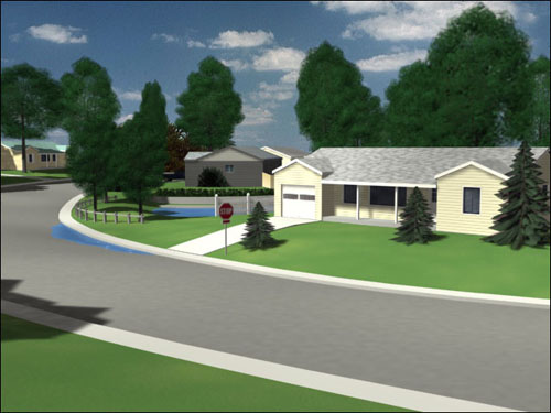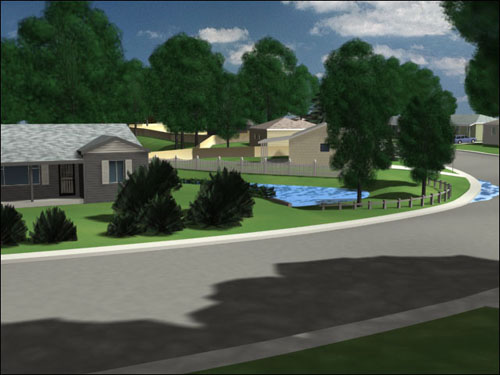 3. 3D Animation of the Holly Hills Detention Pond 3001: A still camera views the 3001 detention pond from the south as the water rises to the ultimate 100 year storm level and overflows into the High Line Canal. 3D Animations Click thumbnail images at right to toggle the animated 3d model visualizations: