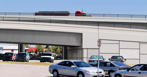 POITRA photographers collected multiple views that would allow the differences in the alternatives to be best described. The Project Engineer made the final view selection. The base photograph was prepared by removing the existing viaduct and restoring the background using traditional digital painting techniques. The piers for the new viaduct that were then partially constructed were left in place to guide the placement of the model viaduct and the ramp alternatives.