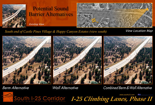 The I-25 sound barrier alternatives for this simulation from Castle Pines Village included large earth berms, tall walls, and small berms with short walls.