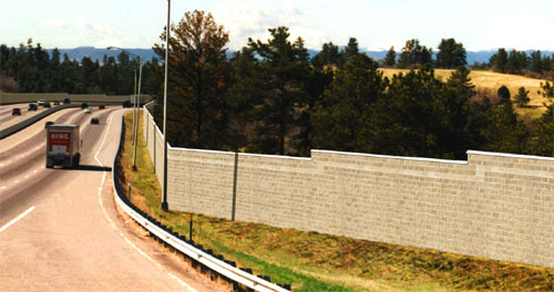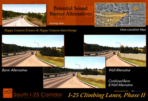 The I-25 sound barrier alternatives for this simulation at Happy Canyon Estates included a short earth berm, a short berm with short walls and a tall wall.