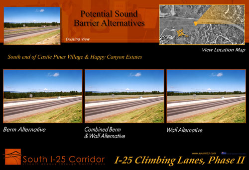 The I-25 sound barrier alternatives for this simulation at Castle Pines subdivision included a short earth berm, a short wall on a berm and full height wall at existing grade.