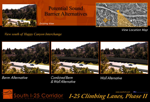 The I-25 sound barrier alternatives for this simulation south of Happy Canyon included a short earth berm, a short berm with short walls and a tall wall.