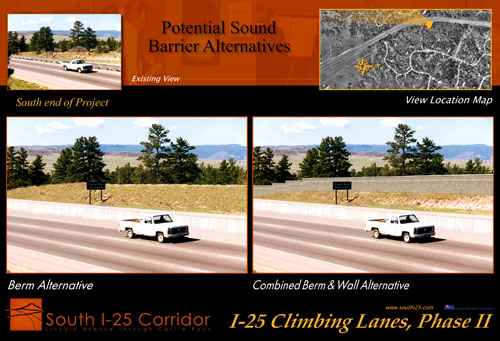 The I-25 sound barrier alternatives for this simulation just north of the town of Castle Rock included a larger earth berm and a new short wall on the existing berm.