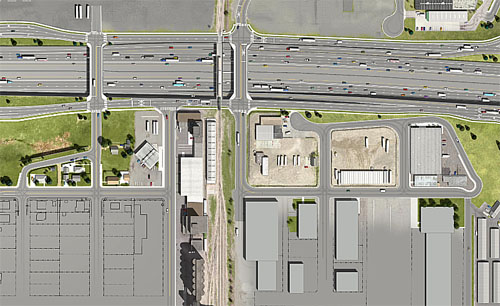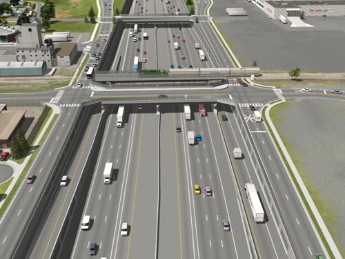 The 3D model included all the residential, commercial and industrial properties within one block of either side of I-70, the FEIS 3D Model included five interchanges, four overpasses and the cover, two rail crossings and five large detention basins.