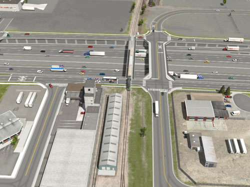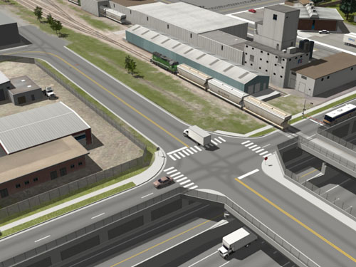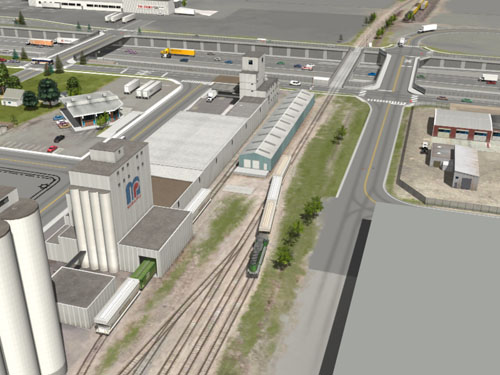 POITRA's extensive collection of stock 3D transportation models, such as locomotives and rolling stock, trucks and automobiles and even houses and trees were used to populate the model.