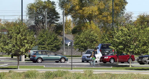 Markers for individual parking lot trees were placed in the model. The site model was then camera matched, lighted, rendered and composited with the base photograph. Tree markers were replaced with tree images in the simulation and station patrons, automobiles and buses were added.