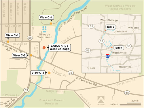 POITRA modelers created a detailed 3D model of the ASR9 Radar Antenna and the proposed 76ft tall tower. An equipment building, site fencing and gates from POITRA model libraries were also used to create a site model for each site. The west Chicago site model was camera matched to the West DuPage Recreation Trail base photograph, lighted and rendered. The renders were then composited to the base photograph and traditional digital painting methods used to finish the simulations.