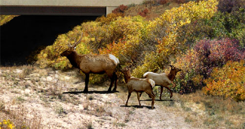 The past bridge and highway design experience of the POITRA Visual principals made it possible to illustrate an accurate structure from very conceptual level plans. POITRA modelers created 3D model bridge structures to be used as a paint template. The models helped ensured correct placement of the new overpass in the engineer provided photograph. The wildlife crossing's approach was to be deepened and border planted with Colorado native vegitation to help direct animals to the crossing. This work was acomplished using traditional digital painting techniques.